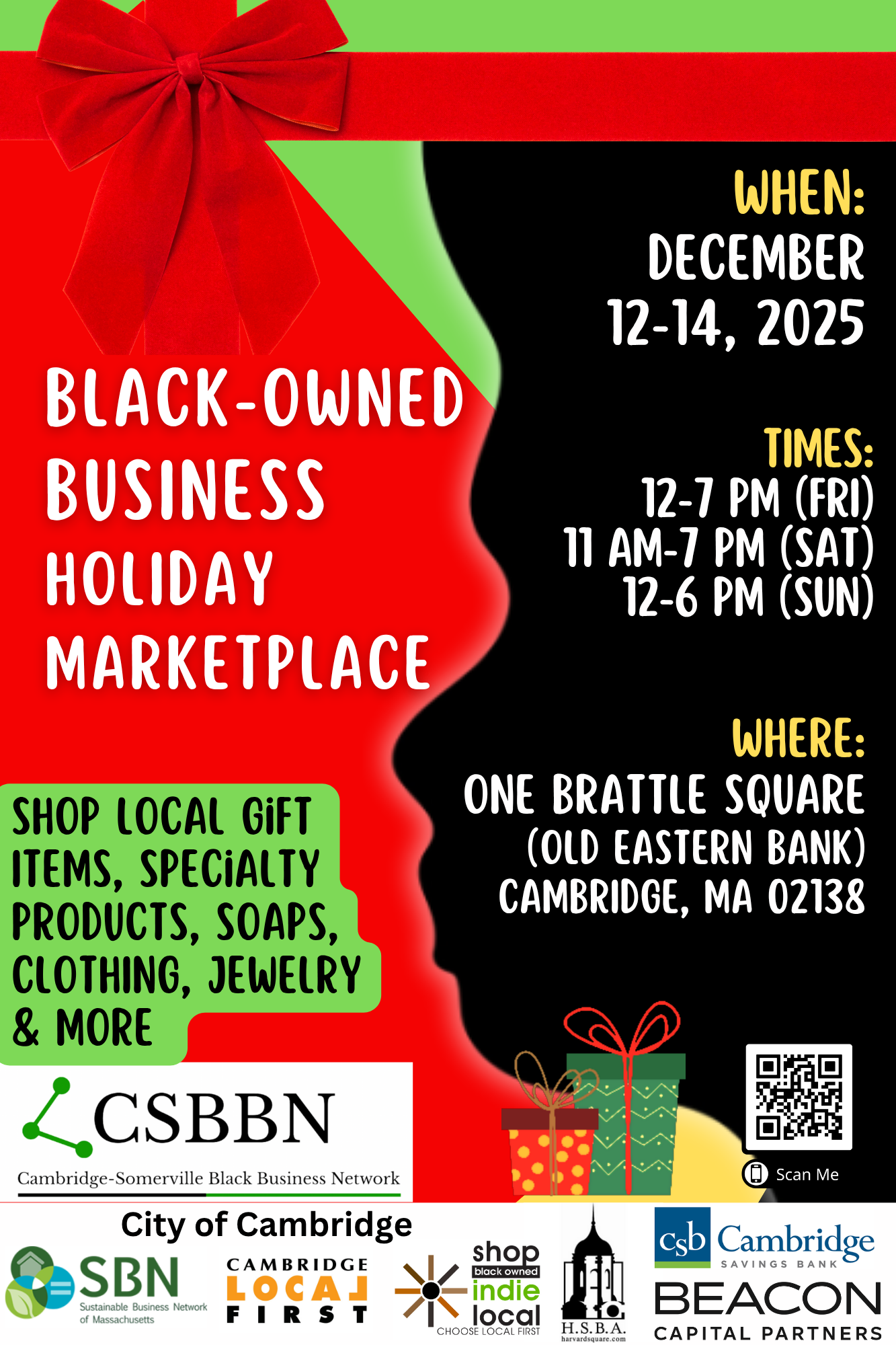 Celebrate the season while supporting local Black-owned businesses! Hosted by the Cambridge-Somerville Black Business Network (CSBBN), in partnership with the Sustainable Business Network of Massachusetts and Cambridge Local First, the 4th Annual Black Business Holiday Marketplace invites the community to discover unique, hand-crafted gifts and holiday treasures. CSBBN is part of Cambridge’s “Shop Local - I’m Local” small business campaign during the winter holidays.